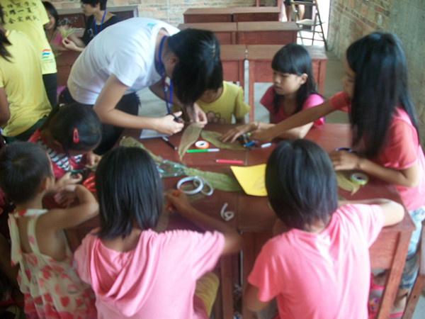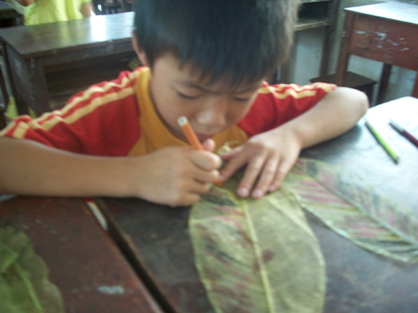 叶脉设计大赛是化学科学与技术学院的特色活动,为了培养孩子们学习化学的兴趣,提高他们的手工制作能力,队员便把叶脉设计大赛带到课堂上。他们先把五名学生分为一个小组,并为每个小组准备了足够的叶脉、剪刀、胶布、材料、卡纸等材料。虽然材料很简单,可孩子们奇思妙想,积极创作。