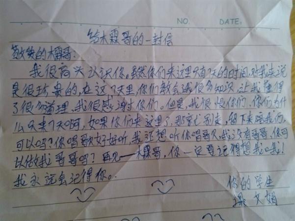 短短的几天的暑期社会实践生活,湛师经管协会实践队的队员们与遂溪黄略镇龙湾村的孩子们建立了深厚的友谊。孩子们所说的每一句话都是如此的真实感人,或许他们不习惯口头表达对小老师们的爱,但他们用稚嫩的双手写下了他们内心最深切的感受。