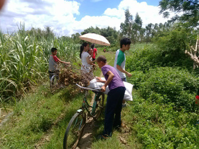 “巧妇难为无米之炊”,我们有米了,但没有柴,该怎么办呢?“上山捡呗。”一个小孩这样说道。当时,在场的队员们都惊讶地微微张开了嘴巴,这对于第一次下乡的我就觉得更惊奇了。后来,经过商量,顶着烈日,在一群当地孩子的带路下经过多番周折,我们终于来到了一片密密麻麻树林的地方。孩子们说:“把干的树枝捡回去就可以当柴烧了,我们家里都是这样子的。”于是,队员们开始动手捡干树枝。第一次在这样的树林里走动,并四周环顾寻找目标物“柴”,真正体验农村的生活。孩子们还把单车借给了我们运柴,这下巧妇不会因无柴而难为了。