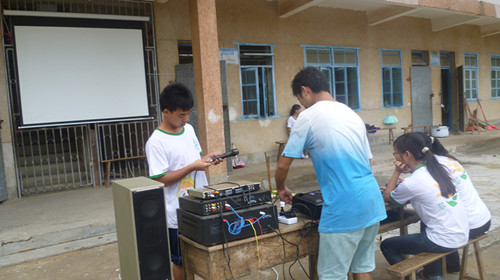 活动前期,队长房晚一已经提前联系好角尾乡苞西派出所和物理院团委实践部,三点左右实践部干部冯勤奋和梁志均终于带着投影仪等工具从雷州市松竹镇西洋小学安全抵达徐闻许家寮小学。在大家的齐心协力下,音响、投影仪等一切设施都在规定的时间内安装好了。这时陆陆续续已经来了许多学生和家长,葵曦队员都热情地邀请他们入座,有的还跟他们拉起了家常。不一会儿,迎来了维持秩序的角尾乡苞西派出所的辅导员等人,他们先是了解了具体,然后又跟队长房晚一巡逻了一遍校园。