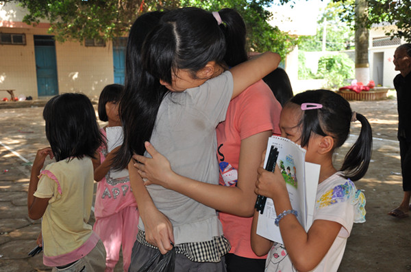 透过车窗,队员们可以看见车外学生那满布泪痕的脸庞,队员自己也不禁落泪,心里充满了不舍与感动。车在启动时,潭板小学的老师与学生也跟着车子走动,并不停地向队员挥手说再见。最后,“宣梦飞扬”社会实践队带着潭板小学老师和学生满满的祝福离开。
