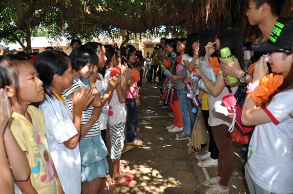 在欢送仪式上,校长与学生共同欢唱送别歌曲,歌声感人动听。校长组织了一部分女学生为“宣梦飞扬”社会实践队27位队员戴红花,学生给队员细心认真地别上红花,并且给每位队员送上刻有“‘三下乡’实践活动留念 潭板小学”字样的保温瓶。在上车前,潭板村的领导干部以及潭板小学的校长、老师排成一列与队员握手言谢。