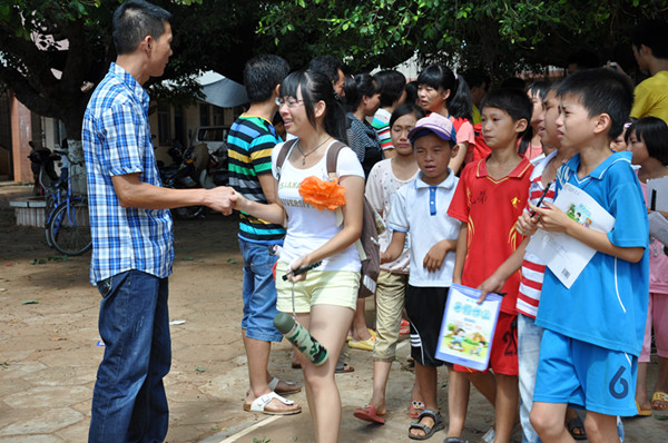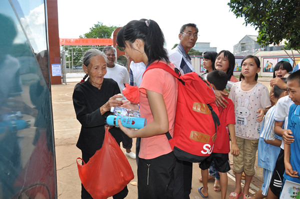 在欢送仪式前,潭板小学全校学生集合在大树下,由校长和老师给他们分发“宣梦飞扬”社会实践队带去的铅笔、练习册等礼品。队员在离校前收拾好行李和打扫宿舍卫生,部分队员也抽时间与学生聊天,珍惜与学生相处的每分每秒。
