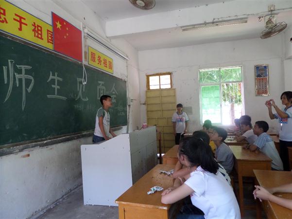 7月14号就开始了正式的支教,一大早七点钟左右,学校的教学楼下面就已经聚集了很多学生和家长。把孩子们分好五个班之后,就由各班的班主任带回教室了。我身为五班的英语老师,也跟着班主任和孩子们到了五班的教室,然后每个班都开始了第一堂班会课。让这些孩子上台去自我介绍,他们都好害羞啊,声音很小,就只有两句话,我叫某某,原来是哪个班的。想想这些十三、四岁的孩子好多普通话都说不准的,教室里特闹腾,毕竟我们都是初次见面,孩子按捺不住兴奋之情,一直往后偷瞄我们,三五成群的议论纷纷。班主任说到选班干,没有一个孩子愿意上去竞选,两个可怜的班主任姐姐在上面使出“十八般武艺”鼓动他们,终于有一两个孩子愿意当班干了。班会课熬完后,下节就是我的英语课了,在下课十分钟的时候我就站在教室门口,准备打上课铃就进去。以前到是做过不少家教,但是真正在班里面站在讲台上上课还是头一回。我开始还有点担心自己会不会紧张,但当我跨进教室门站上讲台的那一刻起,我觉得自己充满了自信,因为我终于感受到了我曾梦想的职业,我很开心能够与这群孩子相识,当他们都齐刷刷的看向我的时候,我就有一种责任感。第一节就是我们大家之间的相互认识,我先以全英的方式做了自我介绍,然后和同学们问好,也就是在上”speaking”的内容。孩子们有些拘谨,我让他们自己找搭档对话的时候他们都不愿意开口。好在有两位比较大胆的女生带了头,先说了起来,后来就学生陆陆续续的想说了。虽然第一节课总是很幸苦的,因为大家都还不太熟悉,不过第二天去上”listening”的时候就感觉好很多了,我与孩子们渐渐熟悉了起来,他们也会亲切的叫我”miss wei”,上听力课的时候发现我们班有两个听力特别好,英语很有天分的孩子,一个男生叫陈文凯,听说他各科成绩都很好,是全年级前十,还有一个女生叫李海欣,是个很聪明的女孩。后来我就推选这两个孩子去参加我们举办的英语竞赛,他们也都取得了不错的成绩。这两个孩子在每次的英语课上都表现的很积极,当然我也会对他们表现好的地方进行表扬。除了文凯和海欣以外,我们班还有一些英语不错也很乖的孩子,陈琳韵,金荟蓉,林晓棠,谢香怡等等。第三天上”reading”的时候大家也都很认真地在纠正自己的发音,比刚开始上第一堂课时连she和he的音都发不准的时候要好多了。第四天上”translating”的时候让他们练习一些简单的英译汉和汉译英的句子,出的题目都是他们以前学过的句型,孩子们回答的都挺不错的。第六天上最后一堂”writing”的时候,以他们去年英语期末考的作文为范例,我写了一篇范文,然后很系统的跟他们讲解了怎么写好英语作文,孩子们都在很认真的做笔记,想想已是最后一节课了也有些舍不得。