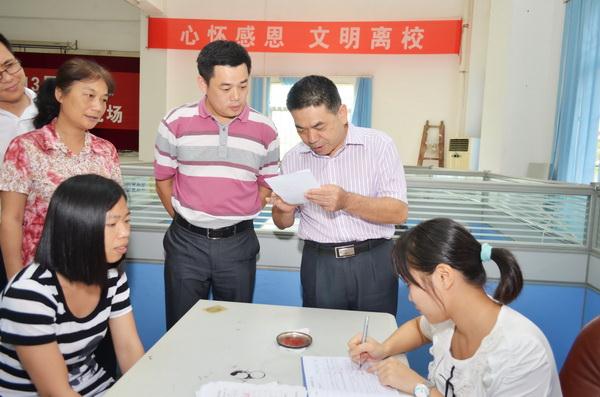 6月17日,教三111室毕业生们络绎不绝,师生们愉快地忙碌着,我校2013届毕业生的离校手续办理一站式服务工作正在有条不紊地进行。学校党委刘海涛副书记、学生处李粤处长、财务处吴华明处长、学生处正处级干部李爱群、财务处梁伟民副处长亲临“一站式服务”现场指导工作。李粤处长向刘副书记介绍了“一站式服务”具体开展情况,刘副书记也到每一个办理点了解离校手续的办理情况,并同在场办理手续的毕业生进行亲切的交谈。