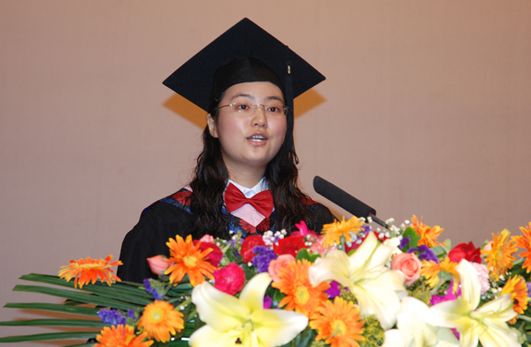 我是来自外国语学院07英教4班的伍涵,今天非常荣幸,能够在这个即将离开母校的时刻,代表湛江师范学院2011届全体毕业生在此发言。我是学校里非常普通的一名学生,2011年2月,我考取了香港中文大学,心中满怀感恩之情!是母校给了我一个奋斗的驿站,一个展示自我、锻炼自我的舞台;是母校给了我奋飞的翅膀,让我展翅翱翔!大学四年,很多人问我,你在学校最大的收获是什么,我会毫不犹豫地说: 自强不息,永不言弃。是的,这就是我在母校最大的收获!