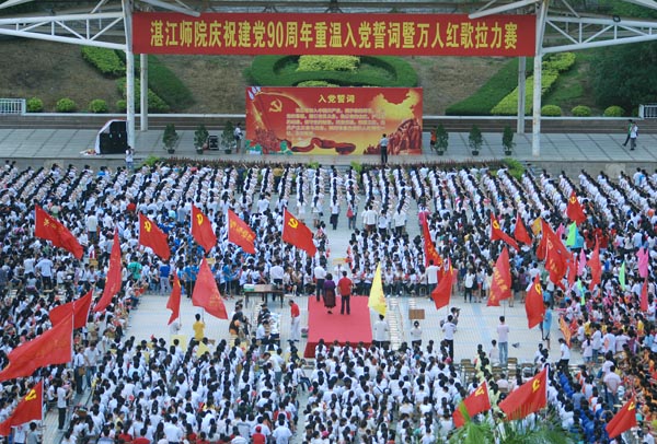 湛师新闻网6月14日讯 昨天下午,为庆祝中国共产党成立90周年,讴歌党的丰功伟绩,继承和发扬党的优良革命传统,传承民族精神,由我校党委主办,党委组织部、博雅教育中心承办的湛江师范学院庆祝建党90周年重温入党誓词暨万人红歌拉力赛在雷阳广场举行。学校党委梁英书记、刘海涛副书记、李江凌副院长、副校级领导胡克伟同志,党委各部门、校团委、博雅教育中心副处级以上干部,二级学院党委书记、副书记、全体辅导员、学生党员及入党积极分子代表等参加了活动。