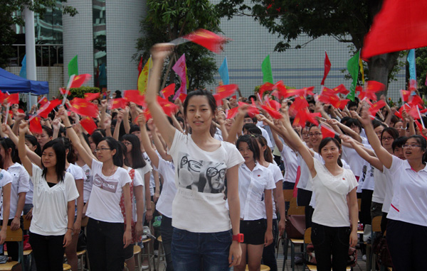 最后,为表达对党的无限热爱,全场人员在雨中合唱《没有共产党就没有新中国》,活动在雄壮嘹亮的歌声中圆满结束。有同学表示,大雨让这场活动变得更有意义,看到这么多人在大风大雨中依然坚持到最后,甚为感动,正如宣传横幅所说:“饮水思源科学发展永远跟党走,同心协力继往开来湛师与日新”。