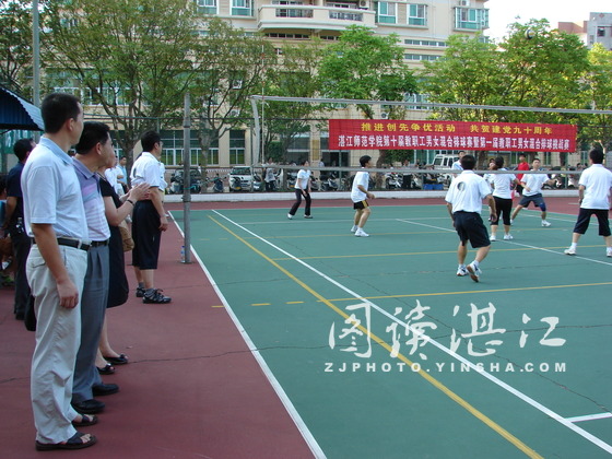 碧海银沙网5月11日讯 为推进创先争优活动,共贺建党九十周年,5月10日下午5:30分,由湛江师范学院工会、党委组织部主办,体育科学学院、教工排球俱乐部承办的湛江师范学院第十届教职工男女混合排球赛暨第一届教职工男女混合排球挑战赛在燕岭区排球场鸣哨开战。湛师党委副书记、工会主席刘海涛,工会常务副主席何征强,工会副主席林剑到场观看了比赛,为球员们加油打气。