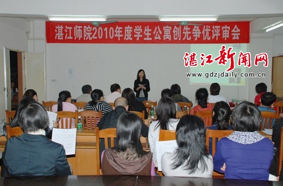 湛江新闻网12月7日讯 12月3日,由湛江师范学院学生工作部主办、学生公寓管理中心、各二级学院学工办承办及学生公寓管理协会协办的2010年度学生公寓创先争优评审会在尚德苑文化活动室举行。学生处钟莉萍副处长,各二级学院学工办副主任及辅导员,学生公寓管理中心四位主任与管理老师,学生公寓管理协会学生干部代表参加了评审会。会议由钟莉萍副处长主持。