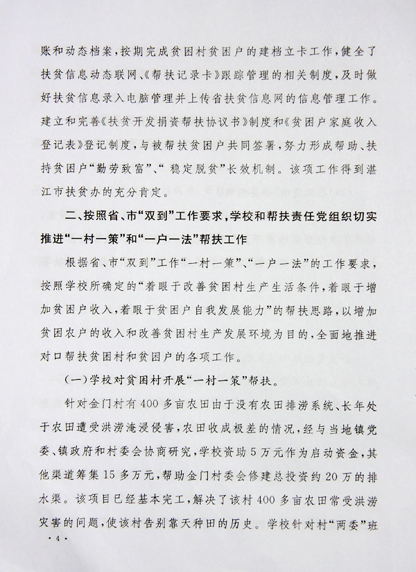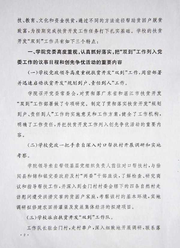 《湛江师范学院在扶贫工作中创先争优》分三部分:一、学院党委高度重视,认真抓好落实,把“双到”工作列入党委的议事日程和创先争优活动的重要内容。二、按照省、市“双到”工作要求,学校和帮扶责任党组织切实推进“一村一策”和“一户一法”帮扶工作。三、积极响应广东省开展“扶贫济困日”工作的号召,基层党组织和党员深入到对口帮扶村开展“扶贫济困”活动。