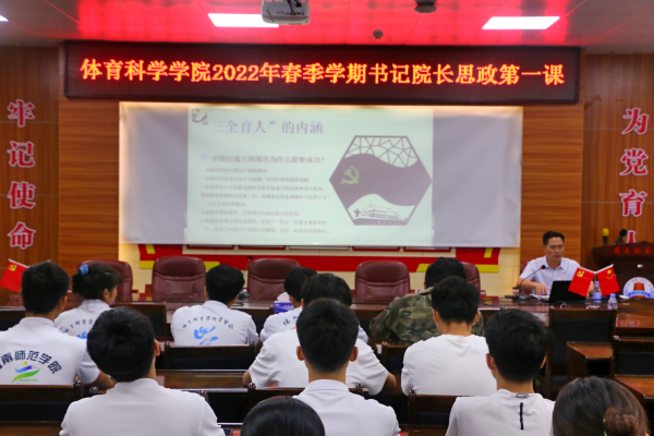 3月21日,体科院在体育馆会议室举行“书记、院长第一堂思政课”。体科院党委庞景才书记、王海涛副院长(主持)分别以“高校三全育人” 和“新时代大学校园体育文化建设中体育专业学生的使命与担当”为主题与体科院全体主要学生干部分享了自己的体会。
