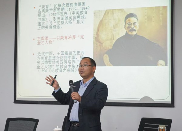 美育是审美教育、情操教育、心灵教育,也是丰富想象力和培养创新意识的教育。乔志强通过介绍王国维、梁启超、蔡元培等民国时期与美育的理论与实践息息相关的人物,生动讲述了王国维以美育培养“完全之人物”、梁启超“趣味主义”之审美教育、蔡元培将美育理念付诸教育实践、“中华美育会”的探索等“美育”发展历程,引导同学们感悟前辈继往开来,敢于尝试的精神,启迪美院学子要从美育中提升审美教育,陶冶情操,温润心灵,激发创新创造活力。