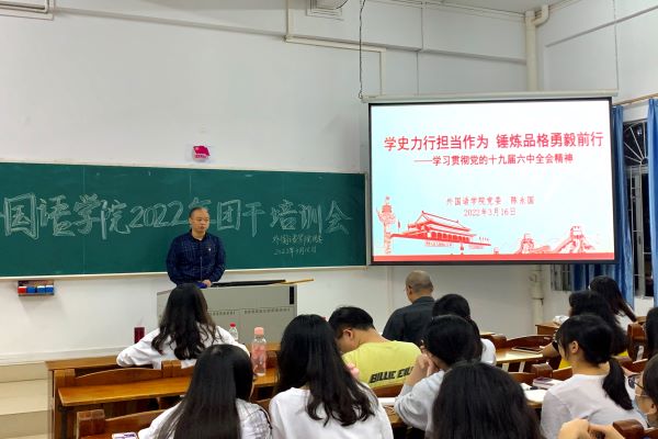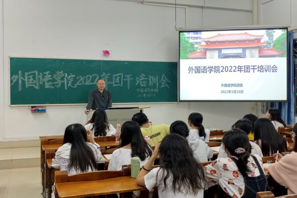 3月16日晚上,外国语学院在教三108室举办了2022年团干培训会,本次培训会由外国语学院团委书记符琪琪主持,外国语学院党委书记陈永国,副书记杨建伟及外国语学院全体团干出席了本次会议。