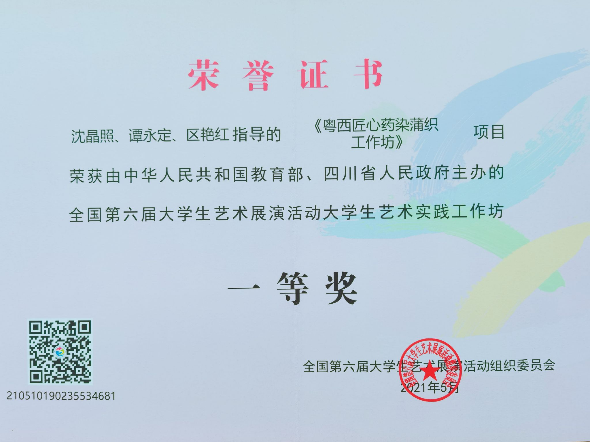 美院优秀党员沈晶照与学院老师共同指导《粤西匠心药染蒲织工作坊》项目获一等奖证书