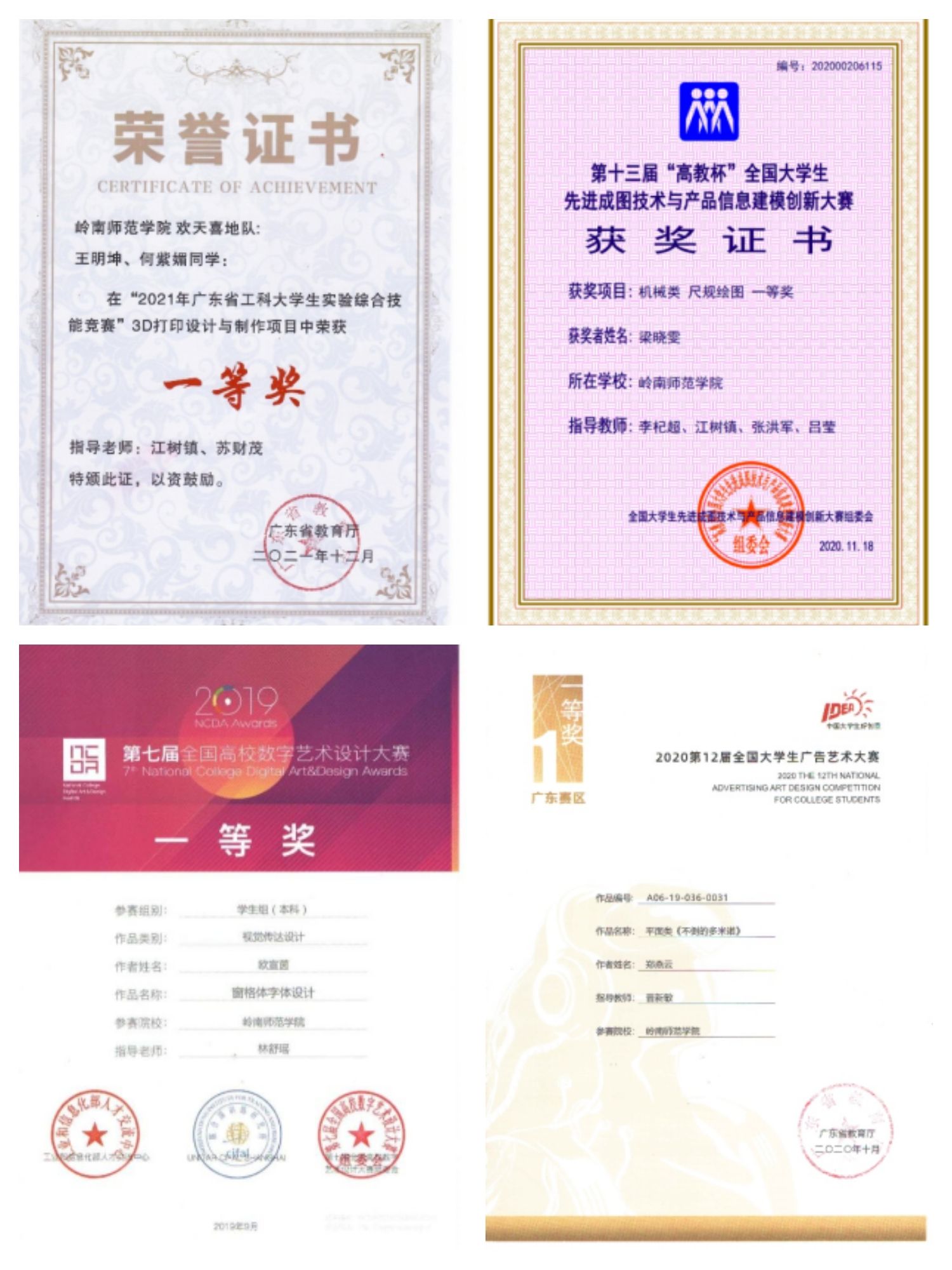 支部党员在指导竞赛方面已形成专业的指导教师团体,拥有丰富的指导经验。参赛学生形成梯队,以老带新,经验传授。近年来连续在各项全国普通高校大学生学科竞赛中取得佳绩,获得中国国际“互联网+”大学生创新创业大赛银奖、铜奖;第十三至十五届高教杯”全国大学生先进成图技术与产品信息建模创新大赛团体二等奖3项,个人奖项累计国奖31项。新加坡金沙艺术设计大赛获得银奖1项、铜奖2项;2020-2022全国高校数字艺术设计大赛国赛一等奖1项,三等奖1项,省赛一等奖3项,二等奖4项,三等奖5项;2020-2022三届全国大学生广告艺术大赛国赛三等奖1项,省奖累计17项;2021-2022广东省工科大学生实验综合技能竞赛一等奖6项,二等奖6项,三等奖1项;中国大学生计算机设计大赛省赛、国赛三等奖各2项;图学类竞赛省奖51项;此外,广东省科技创新战略专项资金(“攀登计划”)项目和大学生创新创业训练计划项目方面均有立项。