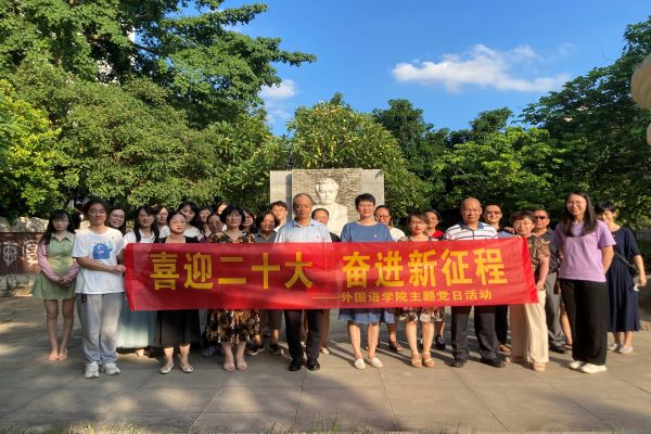 百年风华,红色印记。红色名片,熠熠生辉。为庆祝中国共产党成立101周年,弘扬爱国主义精神,迎接党的二十大胜利召开,6月24日,外国语学院党委组织各支部于谭平山纪念园组织开展“喜迎二十大、奋进新征程”主题党日活动,活动由外国语学院陈永国书记主持,外国语学院各党支部全体师生党员参与。
