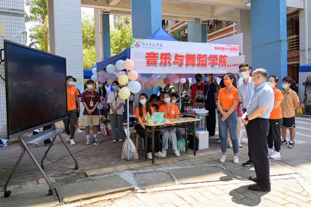 校长阳爱民一行在迎新现场观看音舞学院制作的视频《新征程》(陈玉凤摄)
