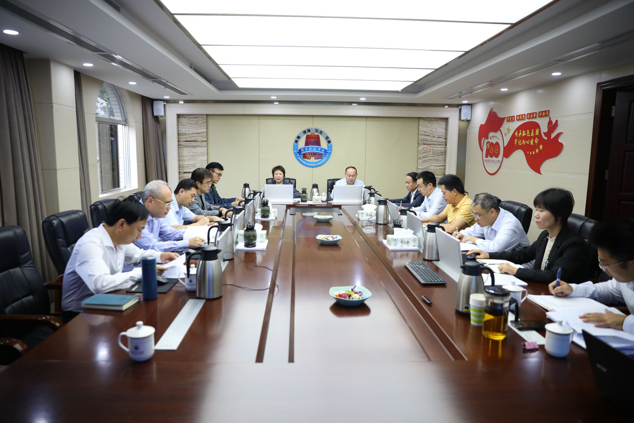 岭师新闻中心讯:10月18日上午,学校党委在一号会议室召开常委会会议,专题学习贯彻习近平总书记在中国共产党第二十次全国代表大会上作的报告和参加党的二十大广西代表团讨论时的重要讲话精神。学校党委书记兰艳泽主持会议并讲话。党委副书记、校长阳爱民,党委副书记黄达海,党委常委、副校长苏古发、戴黍、王胜,党委常委、宣传部部长刘坤章出席会议。