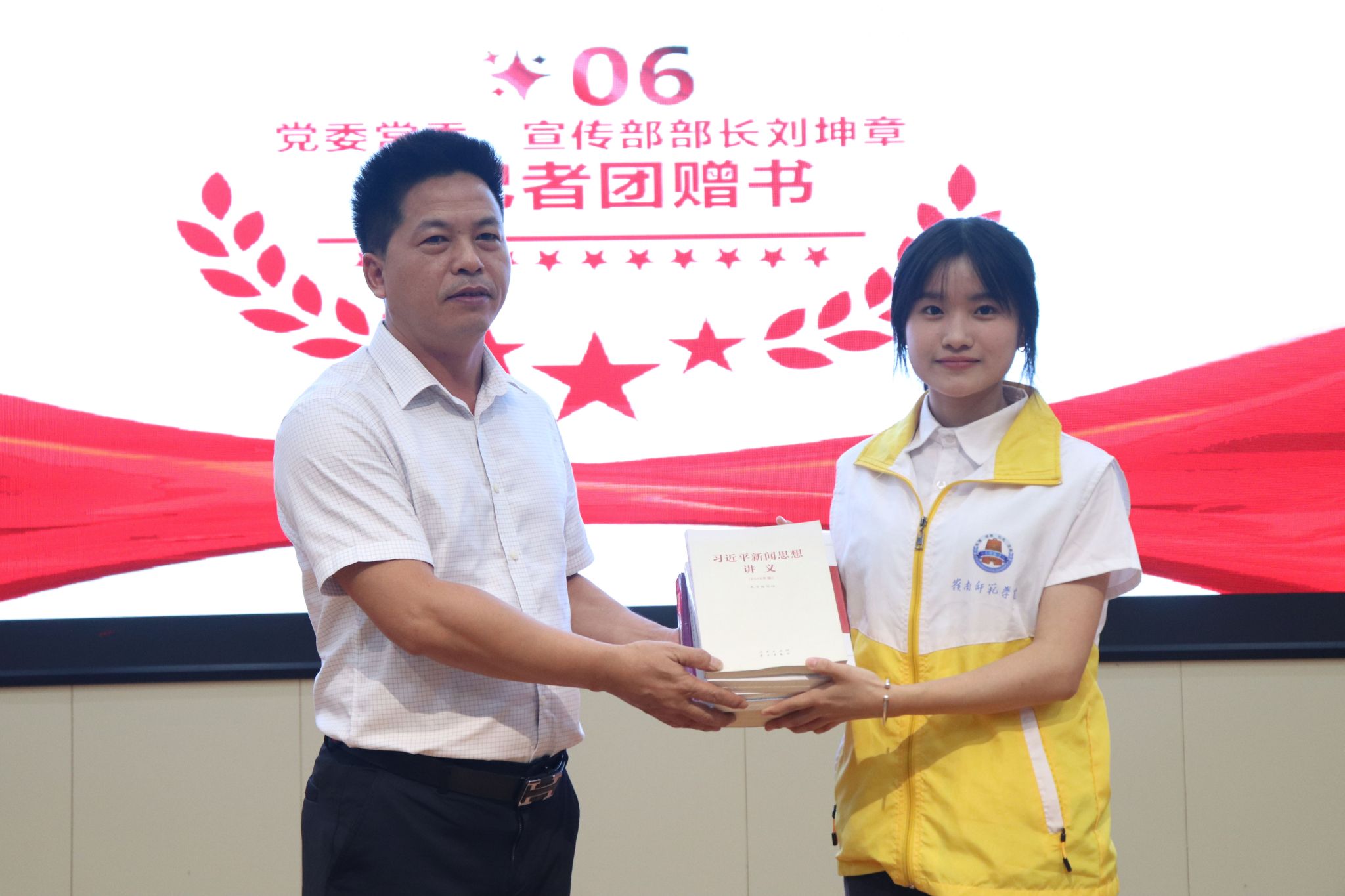 校党委常委、宣传部部长刘坤章向校大学生记者团赠书(吴凯欣 摄)