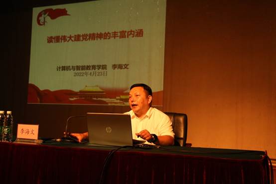4月23日上午,由学校党校主办、计智学院党委承办的2022年第一期党员发展对象培训班在音乐厅开班,计算机与智能教育学院党委书记李海文同志为在场学员做“读懂伟大建党精神的丰富内涵”专题党课。