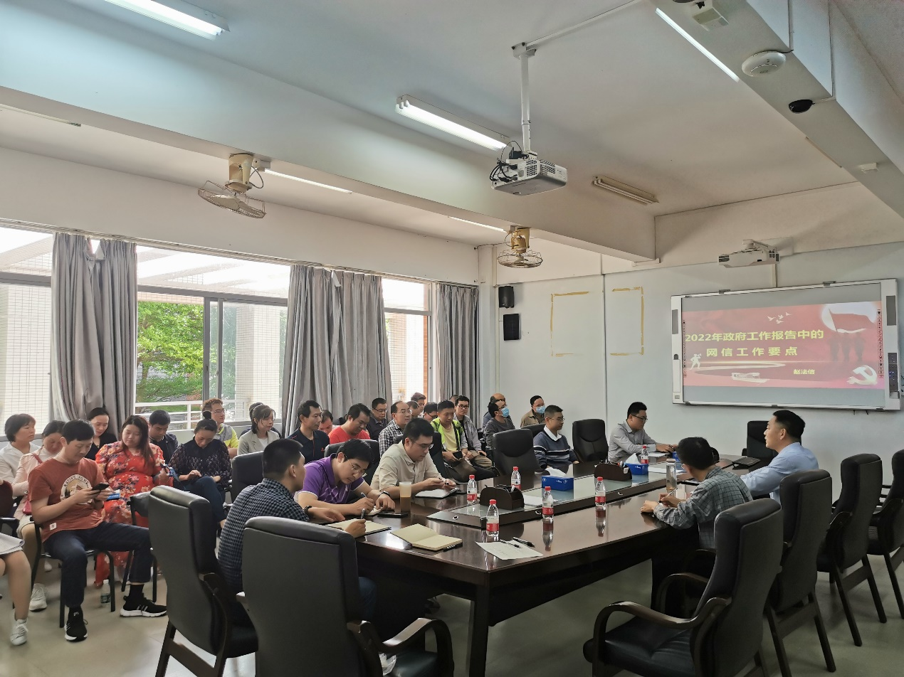 3月31日下午,网信中心召开全国两会精神学习会,中心党总支书记赵法信讲授两会精神专题党课,党课的题目是《2022年政府工作报告中的“网信工作要点“》,会议由副主任郭春才主持,网信中心全体人员参加了学习。