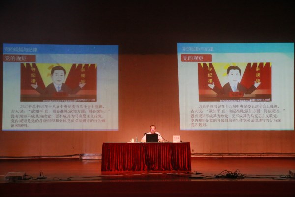 学校纪委副书记、纪检监察办主任付继发以《明规矩守纪律,做新时代合格党员》为题,从先秦诸子百家观点中分析“规矩”、“纪律”的中华传统文化渊源;强调马克思主义政党必须有严格的、铁一般的纪律;认为党章是全体中国共产党员必须遵守的总规矩,是立党之本、行动之规、对照之镜、执纪之尺、护党之宝。付继发结合党章发展史,专业介绍党章的起源、变化,分析党的十九大以来党章内容的最新表述,要求在场预备党员在走向社会前应认真学习党章,以党章观照自身言行,努力保持与党中央言行一致,与组织上言行一致。