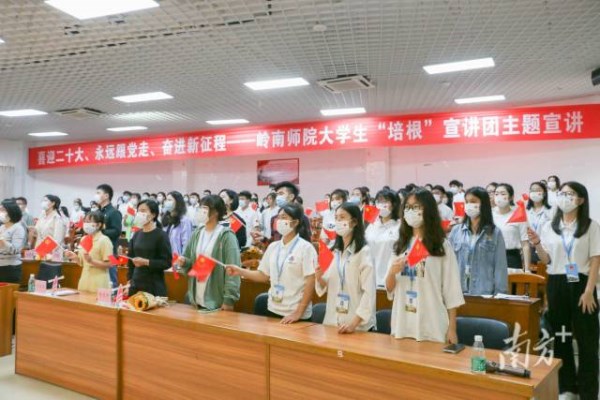 岭南师范学院团委书记林仲彦介绍,学校大学生“培根”宣讲团成立于2021年4月,一年来,100名大学生宣讲员深入师生群体、走出校门,围绕党史学习教育目标要求,通过“线上+线下”形式,累计开展党史、校史、地方史等红色主题宣讲高达202场,覆盖人数超2万人次。