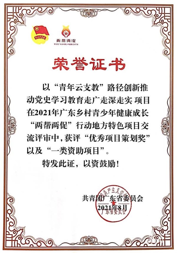 宣讲团积极对接团省委“青年云支教”项目,深入乡村中小学校开展“党史学习教育进百校”活动,帮助乡村青少年健康成长,相关实践项目被团省委评为“优秀项目策划奖”,获“一类资助项目”。