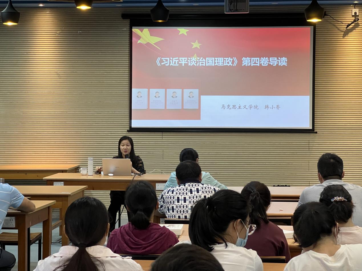 韩小香带领大家回顾了《习近平谈治国理政》第一卷至第四卷的基本内容;详细分析了第四卷的核心要义,深入解读中国之问、世界之问、人民之问和时代之问的主要内涵,使大家加深了对中国之路、中国之治、中国之理的理解;最后对全体教师如何深学细悟《习近平谈治国理政》第四卷做了交流。