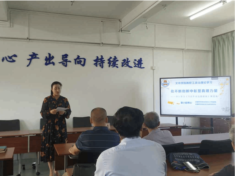 10月12日下午,文学与传媒学院组织全体教职工在教三501会议室学习《习近平谈治国理政》第四卷,旨在引导全体教职工特别是党员干部坚定信心、迎难而上,全面贯彻党的教育方针,落实立德树人根本任务,推动习近平新时代中国特色社会主义思想在学校落地生根,这次集中理论学习会,邀请了学校党委理论宣讲团成员、马克思主义学院童小彪教授作宣讲。文学与传媒学院党委书记陈凯珍主持。