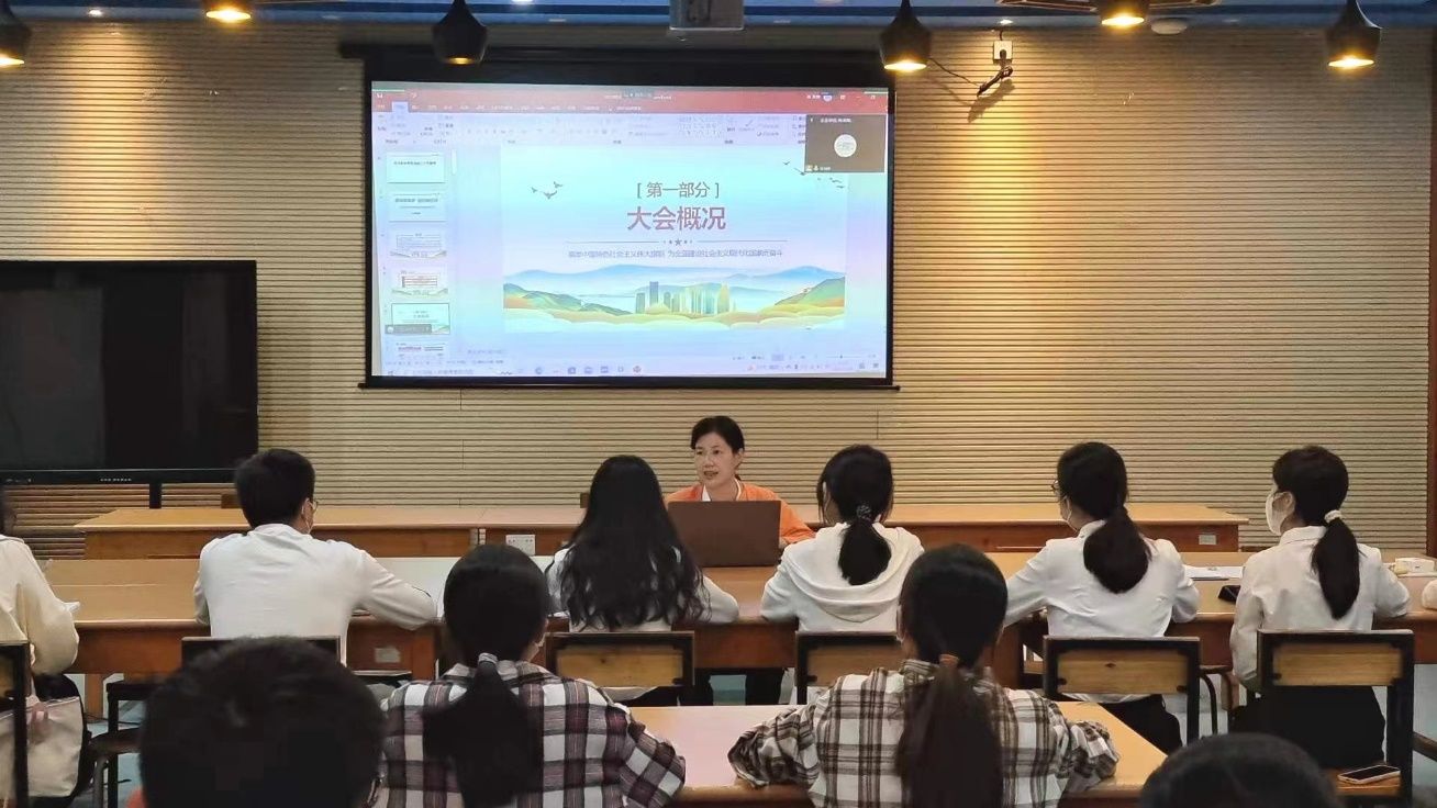 陈碧琼以《激扬青春梦 奋进新征程》为题,从大会的概况和重大意义、报告的主要内容、重要观点、重大举措等方面出发对党的二十大精神做了概括解读,重点学习了报告中习近平总书记对青年和青年工作的重要阐述,从青年与时代的深刻关系、青年工作的地位、青年思想引领的主要任务和内容、青年工作的方法论、对新时代青年的殷切期盼等角度分析了报告的丰富内涵和深刻寓意。陈碧琼指出,新时代的青年学生正处于中华民族发展的最好时期,既拥有广阔发展空间,也承载着伟大时代使命。希望同学们在新的赶考之路上,认真学习贯彻党的二十大精神,深刻领悟“两个确立”的决定性意义,坚决做到“两个维护”,坚定理想信念,筑牢精神之基,厚植爱国情怀,矢志不渝跟党走;党员同学要用实际行动践行党员的先锋模范作用,团结和引领全体同学以“使命在肩、奋斗有我”的时代精神,在学习中奋发图强增长知识本领,在工作中勇于创新突破,以强大的意志直面困难与挑战,以积极的奋斗姿态苦干实干,“让青春在全面建设社会主义现代化国家的火热实践中绽放绚丽之花”,不负时代,不负韶华,不负党和人民的殷切期望。