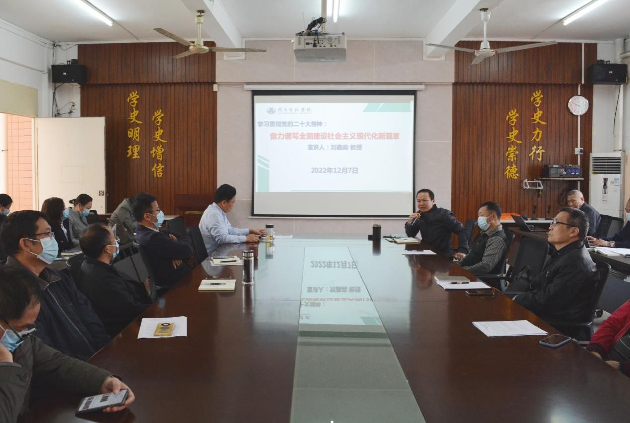 12月8日下午,法政学院召开教职工政治理论学习大会,邀请学校党委理论宣讲团成员、法政学院院长刘鑫淼教授做以《奋力谱写全面建设社会主义现代化国家的新篇章》为题的学习贯彻党的二十大精神专题宣讲报告。法政学院党委书记李德深主持宣讲报告会,全院教职工参加了宣讲报告会。