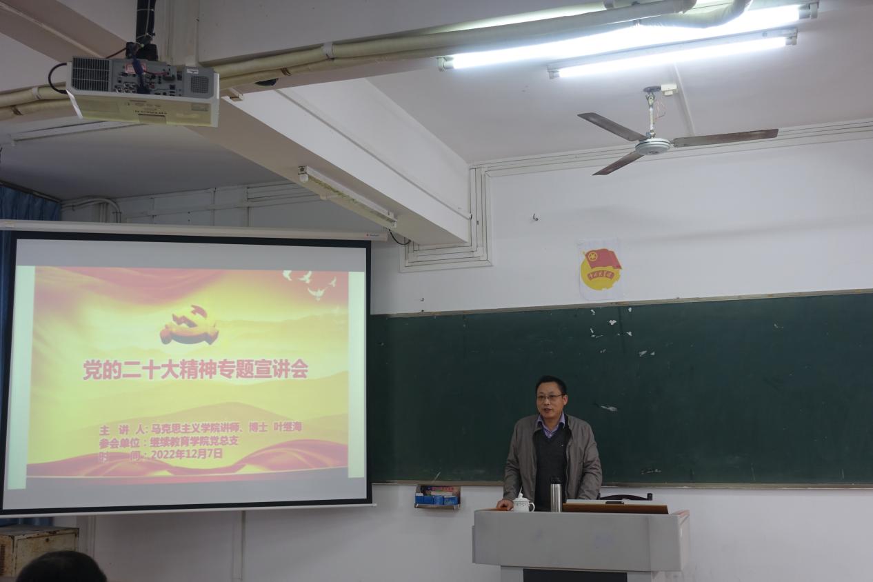 12月7日下午,继续教育学院于教二408教室召开深入学习贯彻党的二十大精神专题宣讲会。学校宣传团成员、马克思主义学院博士叶继海作“走中国式现代化道路实现第二个百年奋斗目标——党的二十大精神学习”专题宣讲。宣讲会由继续教育学院党总支书记、院长曹巧主持。