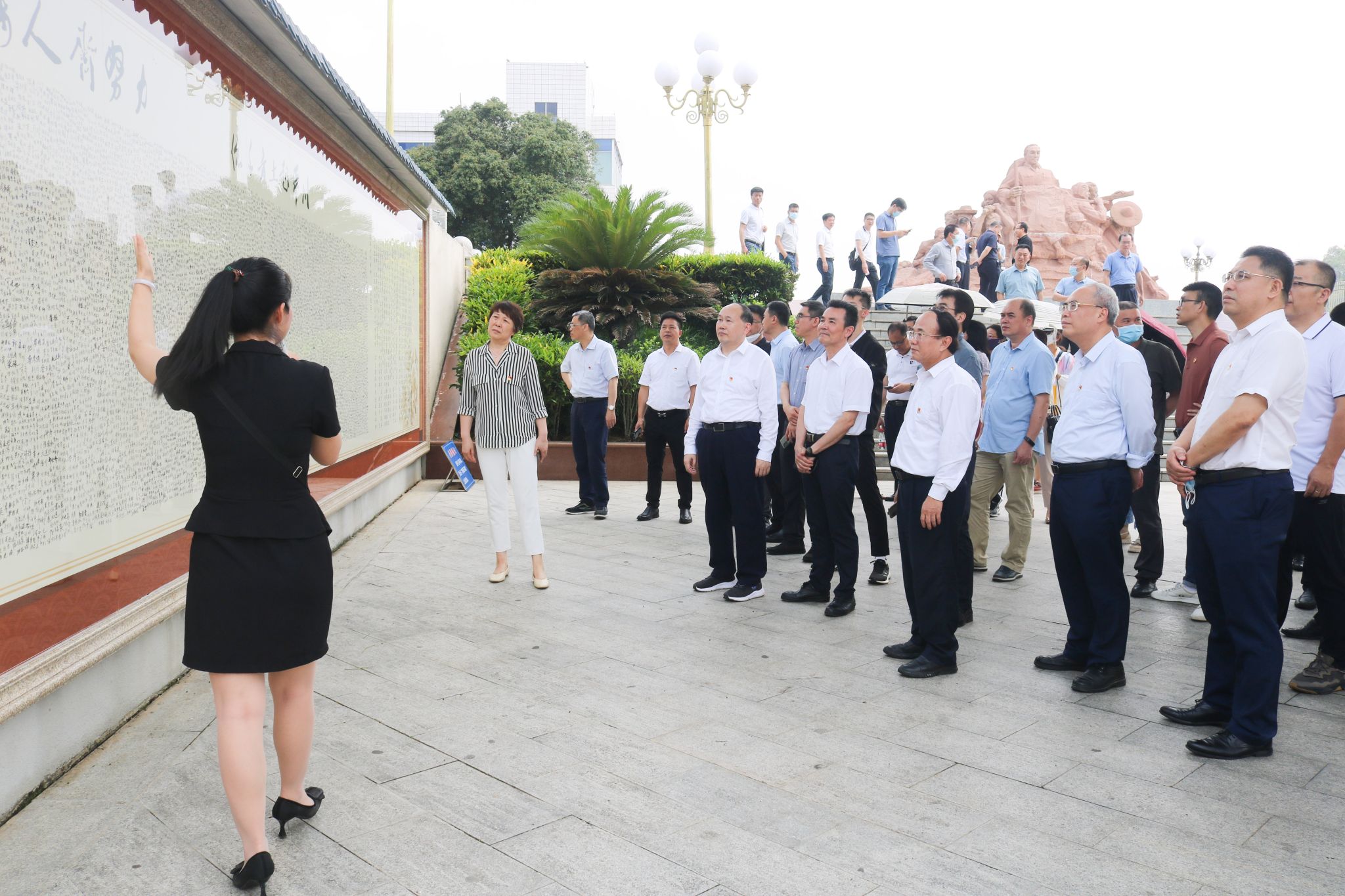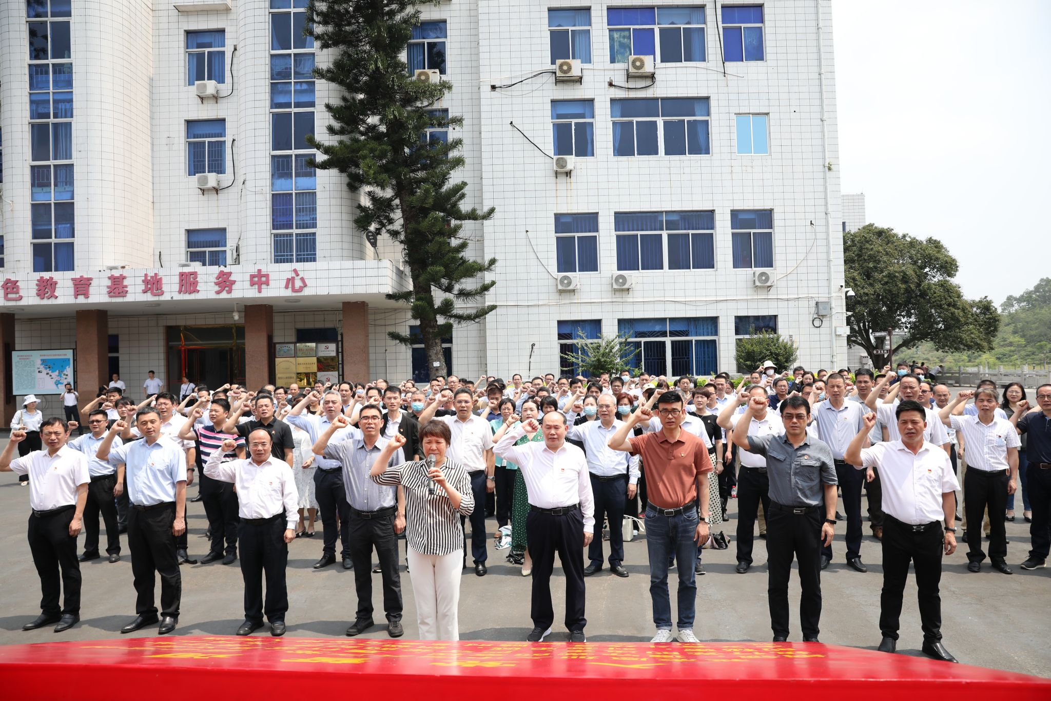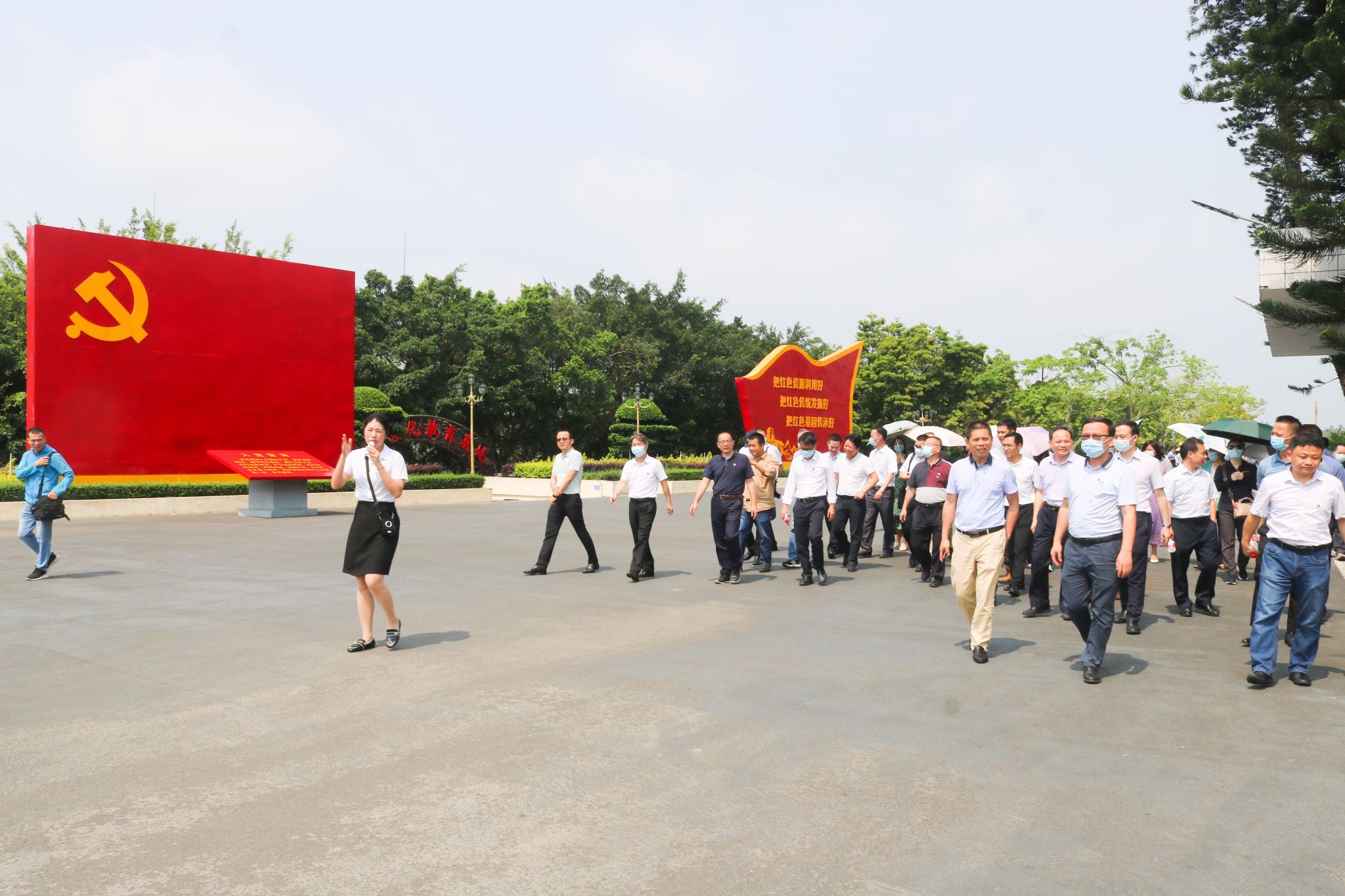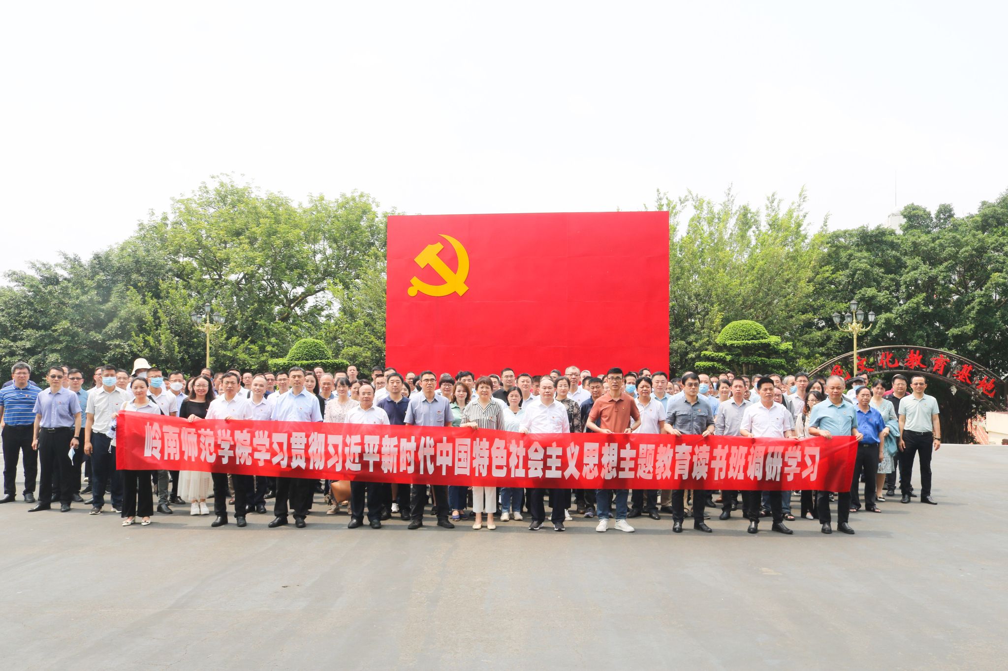 炎炎烈日下,红色教育基地的巨幅党旗显得更加鲜艳夺目。兰艳泽举起右手领誓,全体党员在党旗前重温了入党誓词。学员们通过实地考察鹤地水库红色基地,更加坚定自己的理想信念,纷纷表示要以这次主题教育为契机,充分利用好本土本校红色资源,弘扬中华优秀传统文化、革命文化、社会主义先进文化,传承红色基因,赓续红色血脉,潜心铸魂育人,奋力建设特色鲜明的高水平师范大学,为全面建设社会主义现代化国家、全面推进中华民族伟大复兴贡献力量。