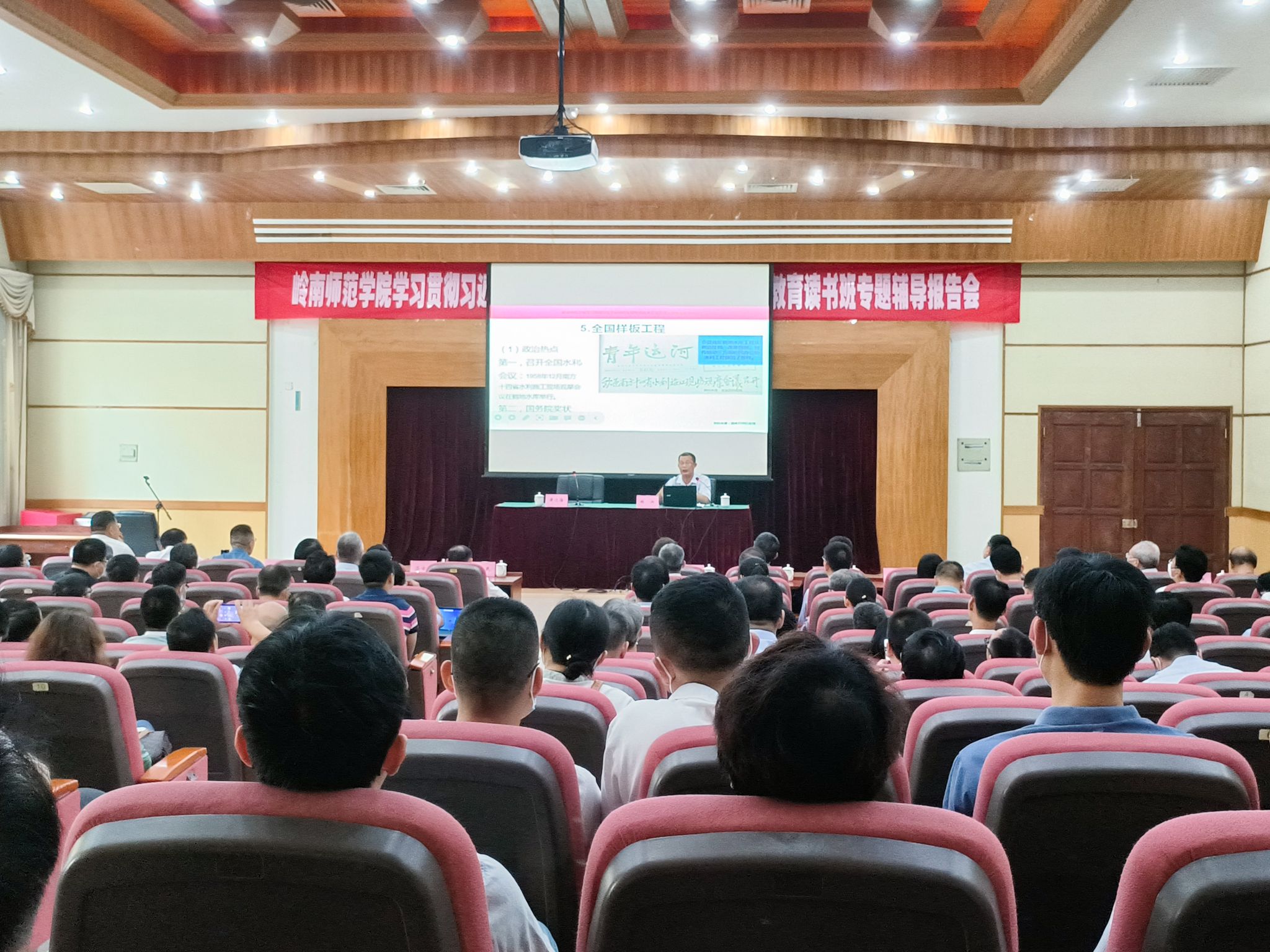 “国家需要、地方担当,以及人民对美好生活的迫切需求,共同造就了鹤地水库、雷州青年运河,现在成了滋养着几百万人民的‘母亲河’。”启程前,学校马克思主义学院林兴副教授以“建库开河及其担当作为的精神价值”为题作专题辅导报告。他认为雷州青年运河建设是“抓好水资源优化配置、推进水资源节约集约利用”的生动实践,也是建设人与自然和谐共生的现代化体现。他结合详实的资料分析了雷州青年运河在全国的地位、全面介绍了鹤地水库与雷州青年运河工程建设发展的恢宏历程,阐述了“建库开河”精神“担当作为、艰苦奋斗、无私奉献、改革创新”的丰富内容和深刻内涵,指出弘扬“建库开河”精神既蕴含学习贯彻习近平新时代中国特色社会主义思想,落实主题教育“学思想、强党性、重实践、建新功”总要求的时代意义,也是广大师生破难题促发展、善作为勇担当、办实事解难题,推动学校高质量发展的现实需要。