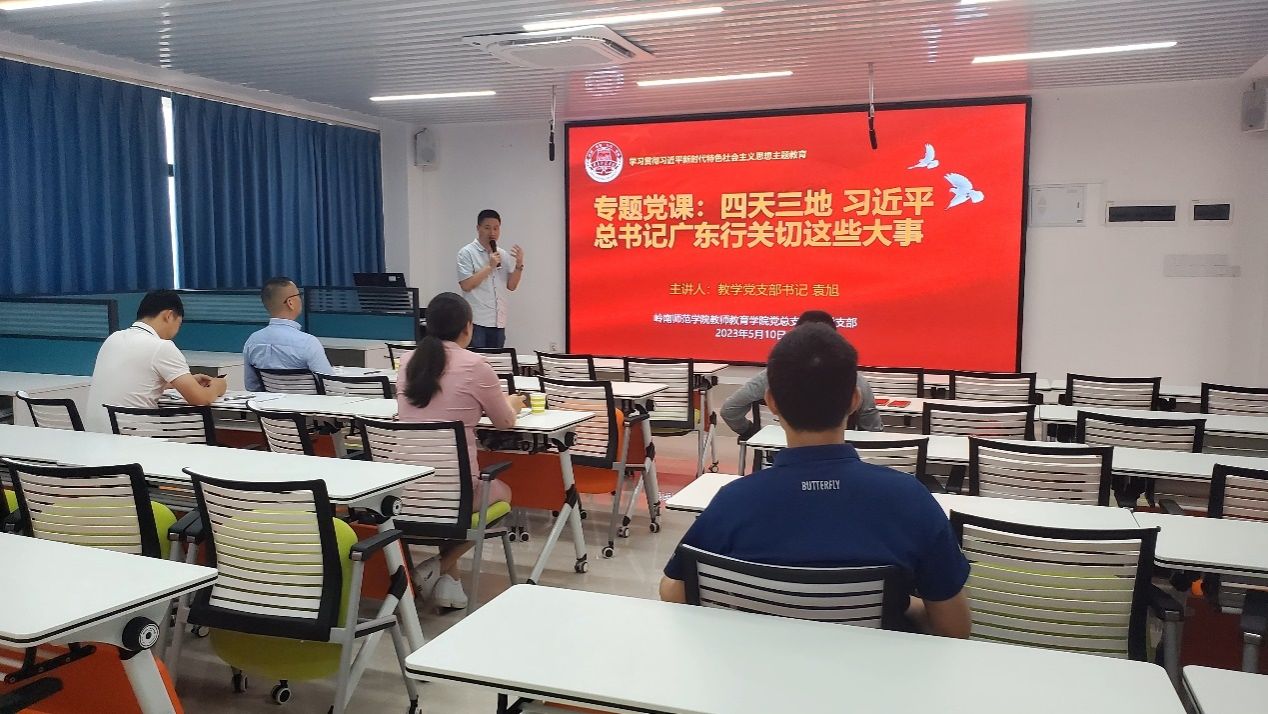 支部书记袁旭讲专题党课《四天三地 习近平总书记广东行关切这些大事》。党课以“四天三地 总书记广东行都去了哪里”为线索,以“透过现象看本质、寻根溯源明深意”为思路,深度剖析了习近平总书记“湛江考察,承载哪些战略考量”、“来到‘荔枝之乡’,再次走进合作社有何深意”、“广州调研这两家企业,蕴含哪些战略思考”。他指出习近平总书记此次广东之行围绕“以学铸魂”,站在推进中国式现代化战略全局高度,就改革开放、科技自立自强、现代化产业体系建设、区域协调发展等作出重要指示,作为党员教师,一定要坚决贯彻落实此次主题教育“学思想、强党性、重实践、建新功”的总体要求,在“强国建设,民族复兴”的伟大征程上,高质量地“为党育人、为国育才”。