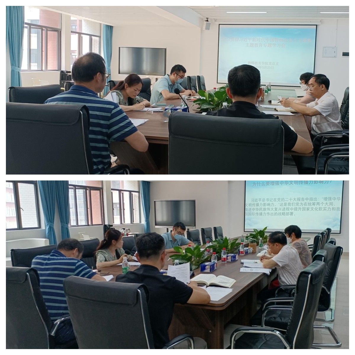 5月23日上午,教师教育学院党总支召开学习贯彻习近平新时代中国特色社会主义思想主题教育集中学习会,专题学习习近平总书记关于新时代中国特色社会主义文化建设——增强中华文明传播力影响力重要思想论述。