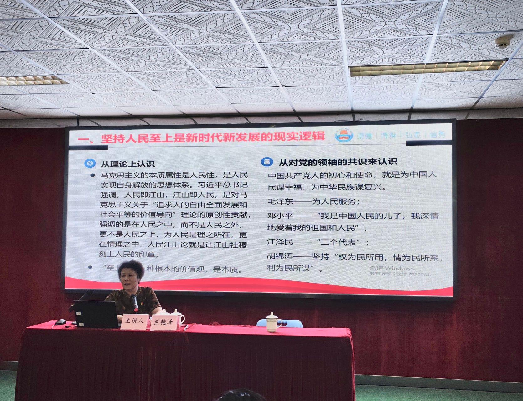 兰艳泽从“坚持人民至上是新时代新发展的现实逻辑” “坚持自信自立是中国共产党人的精神品质”“坚持守正创新是主客观统一的生动实践”“坚持问题导向是对矛盾普遍性的自省自觉” “坚持系统观念是基础性的思想和工作方法”“坚持胸怀天下是一种态度担当和人生境界”等六个方面对习近平新时代中国特色社会主义思想的世界观方法论做了详细解读。她以“‘六一’国际儿童节幼儿园仅安排放假半天”“水电保障影响实验室数据安全”为例,指出,后勤工作牵涉到近3万名师生校园生活的“吃喝拉撒睡医行”,与师生的切身利益息息相关,因此后勤干部职工牢牢树立“人民至上”的理念尤为重要。她强调,岭师教职员工要胸怀天下、立德树人,深化对“六个必须坚持”这一核心内容的理解和领悟,深刻把握这一世界观和方法论的精髓,坚持好、运用好贯穿其中的立场观点方法,一以贯之并长期坚持,才能进而学深悟透习近平新时代中国特色社会主义思想,从而转化成为破解难题、推动工作、促进发展的强大力量。