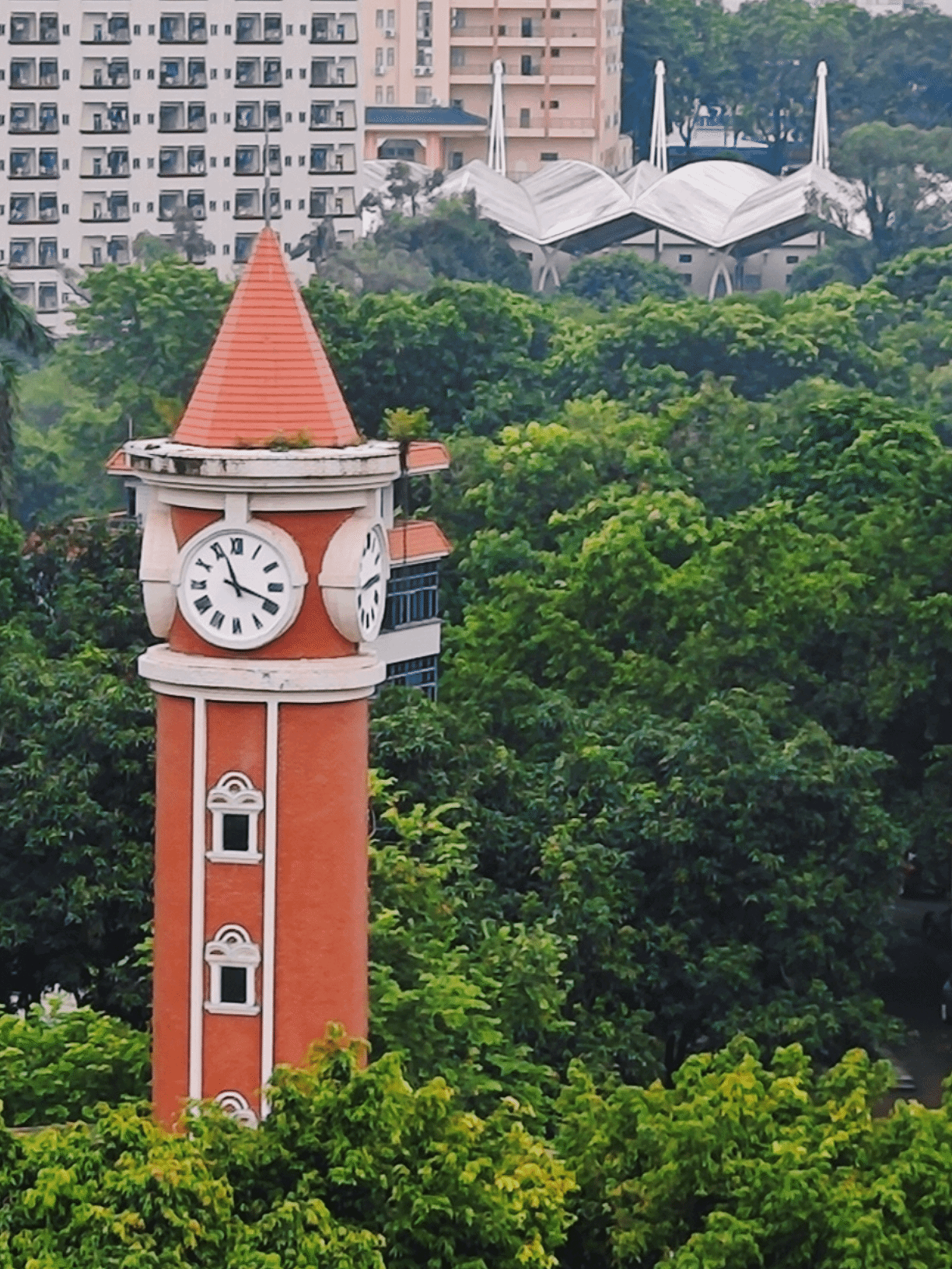 2023级计算机科学与技术专业的李柯婷跨越将近2000多公里的距离来到岭师校园。 “虽然坐了一天高铁,但当我走进岭师校园的那一刻,这些路程都算不了什么,”李柯婷说,“那一刻,我只觉得所有的劳累都不算什么。我很喜欢岭师校园的风景,也很喜欢13期学生公寓的宿舍和舍友。”她的镜头下,红白钟楼高耸在绿林中。照片中钟楼上的指针为她永远记录下收获喜悦的这一瞬间。镜头外,指针仍在转动不停,新的故事还在继续书写……