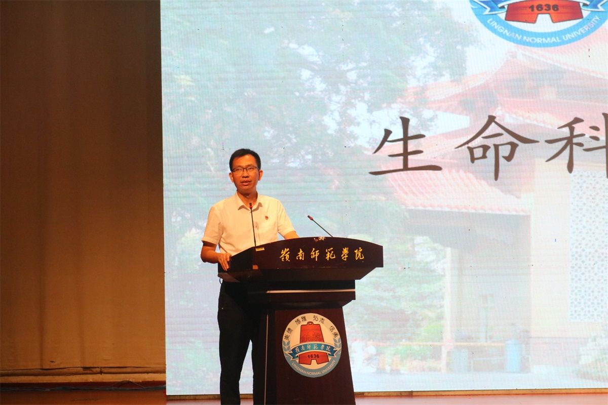 刘锴栋代表全院师生热烈欢迎2023级新生,他向各位同学详细全面的介绍了生科院的各个特色专业以及学院的办学历史、师资力量及近年来所获成绩等情况。刘锴栋院长对新生提出三点希望,一要做胸怀远大理想的模范者,自觉将青春小我融入强国大我,以理想信念作伴,在青春远航中破浪前行;二要做矢志不渝的奋斗先锋,在实现中华民族伟大复兴的赛道上展现我们岭南师范学院生科院学子的风采。三要做心怀大爱的奉献榜样,青春的品格是奉献,青春由磨砺而出彩,人生因奋斗而精彩。希望同学们积极弘扬和传承岭南师范学院大爱精神,勇做走在时代前列的奋进者、开拓者、奉献者;心中有爱,眼里有光,乐于奉献,让青春在为祖国、为人民、为民族的奉献中绽放绚丽光彩。
