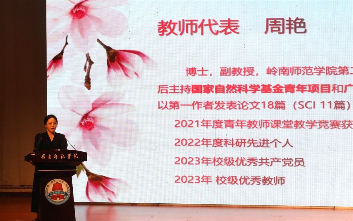 周艳作为教师代表发言,她鼓励新生们珍惜大学的宝贵时光,在不同领域中寻找自己的兴趣,拓展自己的视野,发掘未来的潜力。她提出了三点关于新生应如何度过大学时光的建议。一是做人和做事要尊重他人,理解包容,积极参与社团和志愿活动。第二是要学会学习和思考。第三是学会拒绝诱惑。最后,她强调青春是一段充满激情和活力的时光,但也是努力学习和不懈奋斗的时光。希望大家能一起成长,追求共同的梦想。