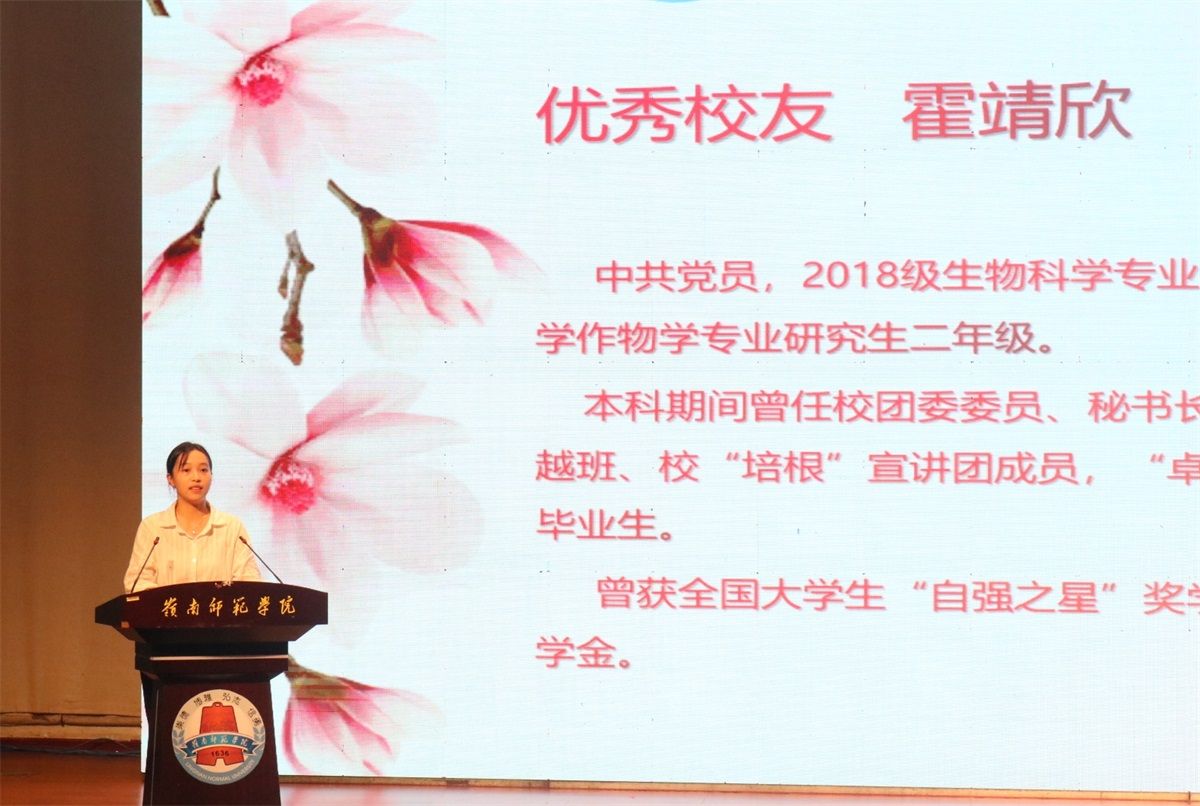 优秀校友代表2018级生物科学专业霍靖欣表示希望新生能在大学期间不断去探索,不断突破自己,度过充实的大学生活。她根据自己的学习经历,提出了三点看法;一是应坚定理想信念,学好专业知识,二是要积极参加科研活动,创造更多的考研硕果,三是应积极参与课余活动和社会实践,为社会作出贡献。最后,她希望新同学理解大学生活里的意义,因超越自我而坚韧,因服务奉献而深刻,因拥抱未来而长远。