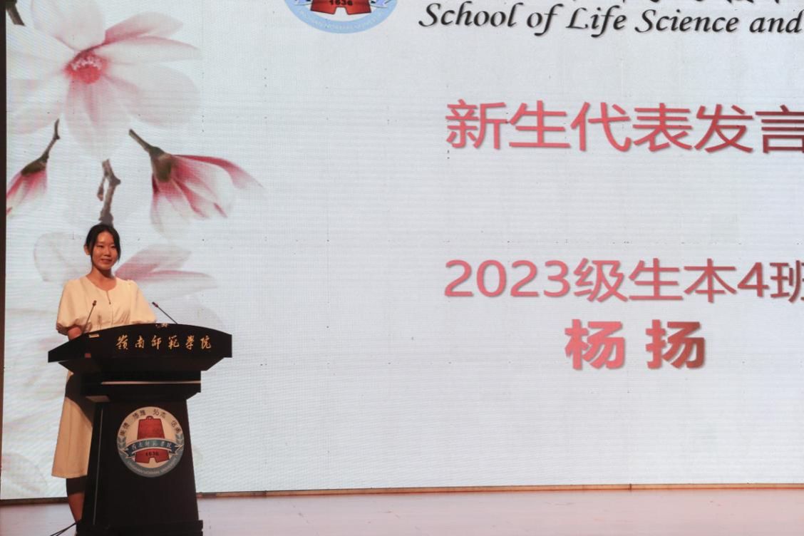 新生代表杨扬表达了她对12年寒窗苦读的追忆以及对大学四年生活的向往,她认为接下来四年的学习和生活将贯穿以下3个关键词:“青春、理想、奋斗”。同学们正值青春年华,要为国家和民族的未来奉献青春的力量。青年人应有理想,有理想,才有前进的动力,生命才会有意义;奋斗则是青春最亮丽的底色。