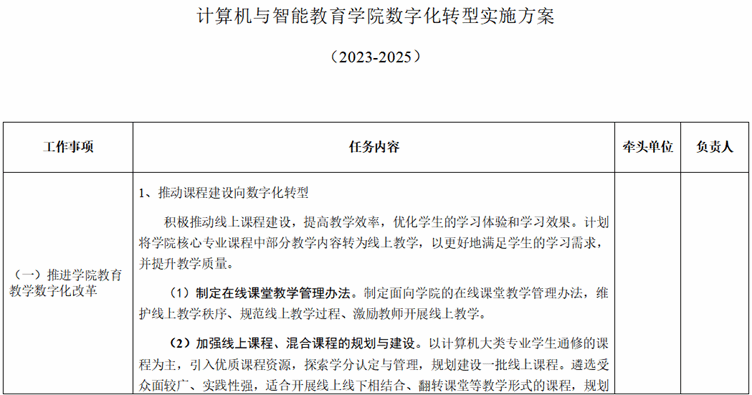 学院通过制定《计算机与智能教育学院数字化转型实施方案》,从推动课程建设向数字化转型、培养数字化专业人才、提升师生的数字素养和教师数字化教学能力、加强教育数字化研究工作四个方面落实数字化转型行动。