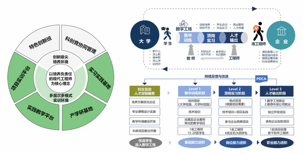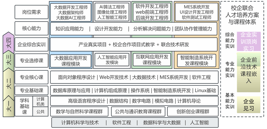 以“提升实践创新能力”为核心目标,以联合实验实训室为抓手,校企联合建设实践教学平台、项目实训平台、产学研基地、实习实践基地,打造“多层次多模式实训环境”,提高学生解决实际问题的能力;通过开办特色创新班、打造科创竞协同管理体系,创新拔尖人才培养环境。学院与企业共建数字工场,形成“素质-知识-能力-经验-成果”递进层级的人才培养实施过程。构建“理论学习-实践训练-能力提升-价值塑造-领域创新”的创新实践体系,支撑学院实践教学改革。