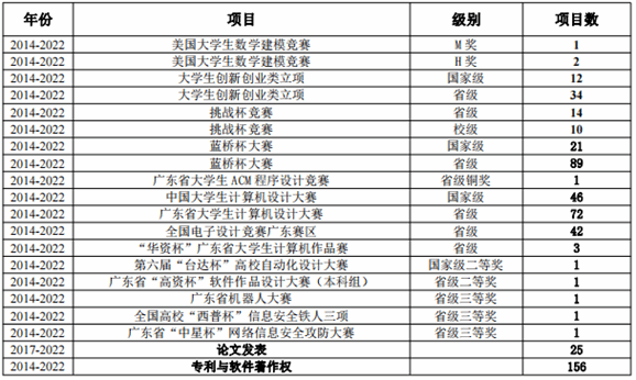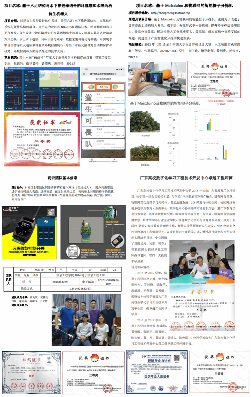 目前,学院建成省级实验教学示范中心2个,省级大学生校外实践基地1个,校外实习实训基地和产学研基地30多个,教育部产学合作协同育人项目13项,校内在线实训平台4个,与企业联建设了项目实训平台及产业项目案例资源8门。学生实践创新创业能力显著提升,获得省级以上奖项近200项,“攀登计划”、大学生创新创业训练计划等项目30余项,授权实用专利、软件著作权登记等30余项,孵化初创型企业3家,其中“山区坡地果树植保无人机”获互联网+大学生创新创业大赛广东省银奖、国家级铜奖,“基层公共卫生健康数据采集系统的研发与应用示范”参加全国大学生创新创业年会展示汇报。