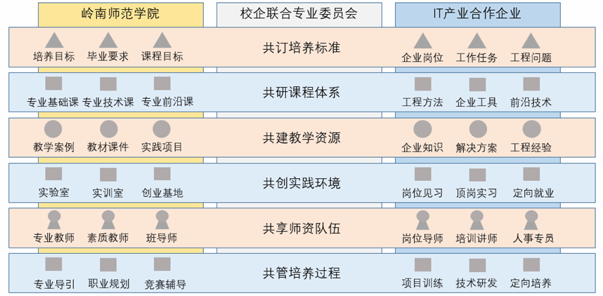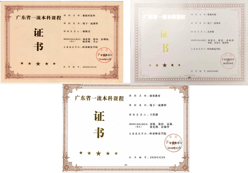 学院探索和实践高素质复合应用型计算机类人才培养新机制,创新产教融合理念,提高人才培养质量,经过多年的探索实践,形成了新工科导向的计算机类专业“一核六维”的人才培养模式,“一核”是以培养高素质复合型计算机类专业人才为核心理念,“六维”是以共订培养标准、共研课程体系、共建教学资源、共创实践环境、共享师资队伍、共管培养过程的实践路径。通过凝练典型岗位、典型任务、工作场景中的典型复杂工程问题,精准制订培养目标与毕业要求,并通过校企联合专业委员会,实施“2+1+1”四年全覆盖的校企协同培养进程,即2年工程基础能力培养,1年工程技术能力培养,1年工程实践能力培养,发挥校企协同育人的关键作用,扎实推进新工科建设。教学改革成果“新工科背景下地方高校计算机类专业人才培养模式创新与实践”获得2022年广东省教学成果一等奖。