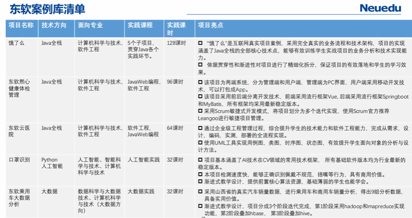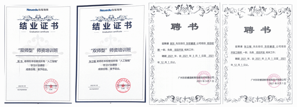 优化校企双方人才聘任机制,聘请企业优秀技术和管理人才任职兼职讲师,定期选派校内教师到企业挂职锻炼,逐步建设一支具有教学经验丰富、工程实践能力扎实和一定应用型创新经历的师资队伍,从根本上解决了应用创新型和工程实践型教学师资匮乏的难题,有力支撑了一流人才培养。近年来,聘请了10名东软工程师来校进行实践性较强的课程教学和实习实训指导工作,聘请了华南师范大学汤庸教授等12位高校和企业的专家学者为专业建设校外咨询委员会委员,聘请了11位企业工程师为学生的企业导师,指导学生的课外实践学习。组织专任教师参与软件开发、大数据、人工智能等内容的培训近100人次,被企业聘为软件开发工程师教师共10名。