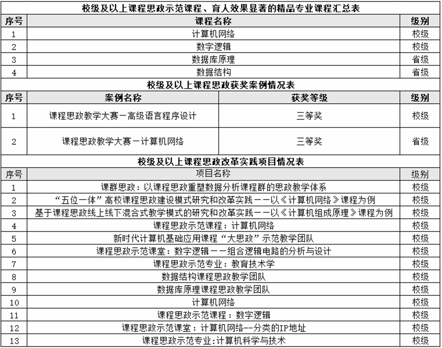 坚持育人为本,校企联合优化与重构计算机类专业的课程体系,培养有深度和广度的计算机类综合化复合型人才。按照课程或教学环节从通识或基础到专业,工程问题由简单到复杂,工程能力培养从初步到综合,加以企业真实工作环境下的项目实训,将思政教育、素质教育、创新创业教育贯穿人才培养全过程,从学科基础、专业基础、专业核心、专业选修、综合实训五个层次组织课程,形成了数学与自然科学群、公共与通识教育群、创新创业课程群、计算机类学科基础课、专业基础课程群、专业核心课程群、专业选修课程群、企业综合实训课程群八个课程群,建立底层共享、中层融合、高层互选递进式课程体系。本课程体系能根据科学技术进步和行业、产业发展,不断自我动态调整和完善。学院建设有“信息技术创新与实践教学团队”和“智能信息处理及应用教学团队”等省级教学团队2个、省级一流课程3门、学堂在线等平台上线课程3门、与东软睿道教育集团等共建实训平台4套、出版17部规划教材,并在20多所院校中得到推广使用。
